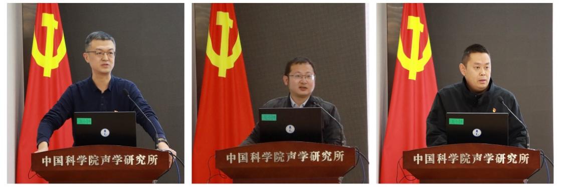 水下航行器党总支书记刘明刚、噪声与音频声学党总支书记白国锋、智能网络与信息处理技术党总支书记朱小勇作学习党的二十大精神重点发言。聚焦发挥党建引领作用,推进党建与业务工作的深度融合,他们紧密结合实验室科研任务实际,分别以“扶贫攻坚”“宁静中国”“网络强国”为主题,围绕带领党员提高政治领悟力、强化国家发展的战略支撑、科技创新切实转化为实现高质量发展的思路举措等内容,同与会同志交流心得体会。他们一致表示,要坚定信心,埋头苦干,始终牢记使命和责任,坚决把党的二十大精神落到实处。