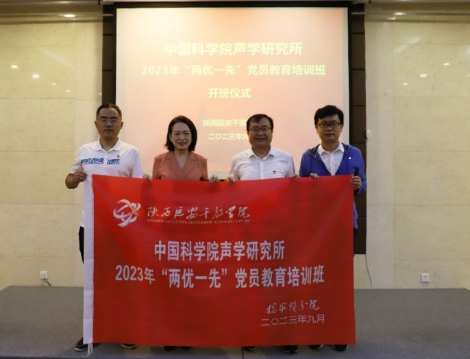 陕西延安干部学院常务副院长庄庆萍与杨军副所长为党员教育培训班授旗