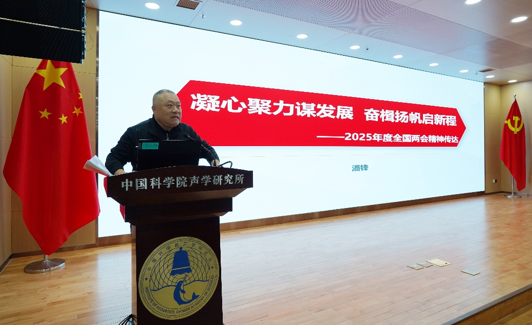 党委委员、所长李风华在发言中谈到,要认真学习贯彻习近平总书记重要讲话和全国两会精神,在思想上政治上行动上同以习近平同志为核心的党中央保持高度一致,紧密围绕抢占科技制高点核心任务,凝心聚力,统筹推进,高质量完成好“十四五”规划任务;聚焦国家重大需求和声学领域前沿,强化组织领导、坚持集思广益,系统谋划好 “十五五”规划编制和研究所改革创新发展,为高水平科技自立自强、建设世界科技强国贡献声学力量。