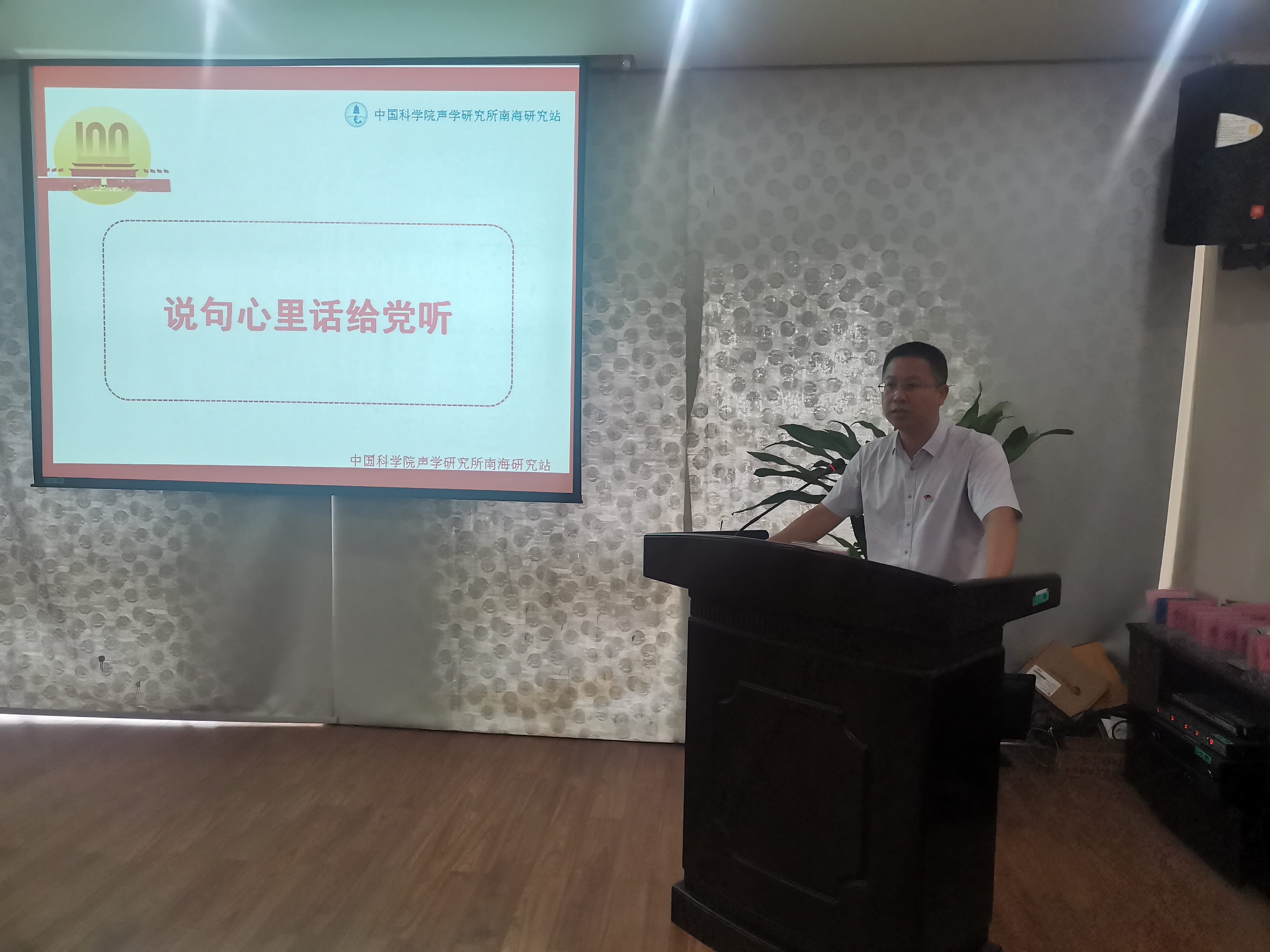 最后,甘维明作总结发言。回望中国共产党披荆斩棘、艰苦卓绝的一百年,党带领中华儿女开创了亘古未有的宏图伟业,谱写了气壮山河、彪炳千秋的篇章。事实充分证明,我们的党是富于创新精神、与时俱进的党,是富有生机和活力,富有凝聚力、战斗力,经得起任何考验的党。南海站在建站之初就秉承着红色的基因,六十多年来,几代南站人励精图治、开拓进取、迎难而上、甘于奉献,接续服务于国家水声事业。面对新形势、新任务,我们要不忘初心,更加自觉地牢记党和国家赋予的责任和使命,全站上下进一步统一思想,在习近平新时代中国特色社会主义思想的指导下,不断增强“四个意识”,坚定“四个自信”,做到“两个维护”,弘扬并践行科学家精神,围绕中心工作,勠力同心,攻坚克难,真抓实干,加快推动南海站各项工作迈上新的台阶。