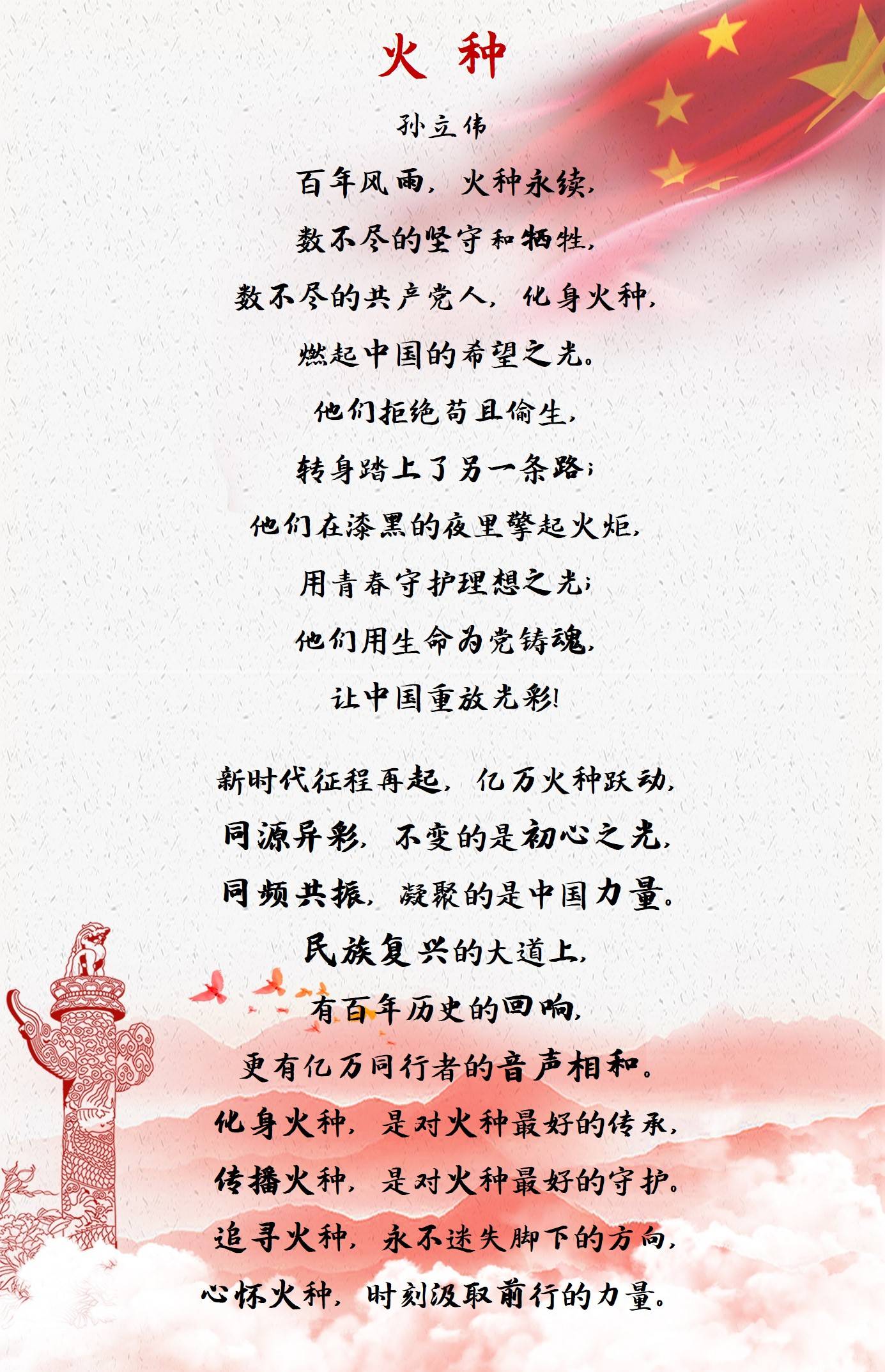 资产条件保障部孙立伟同志创作现代诗《火种》,赞美共产党人化身火种,燃起中国的希望之光,用生命为党铸魂,获得诗歌类三等奖。