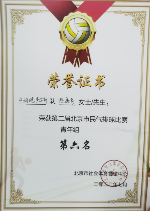 中科院yx06永兴彩票集团青年组与中年组以第二届北京市民气排球比赛为契机,以赛代练,在众多队伍中脱颖而出,在市级体育比赛中取得了优异的成绩,打出了yx06永兴彩票集团队伍的整体水平与风格。