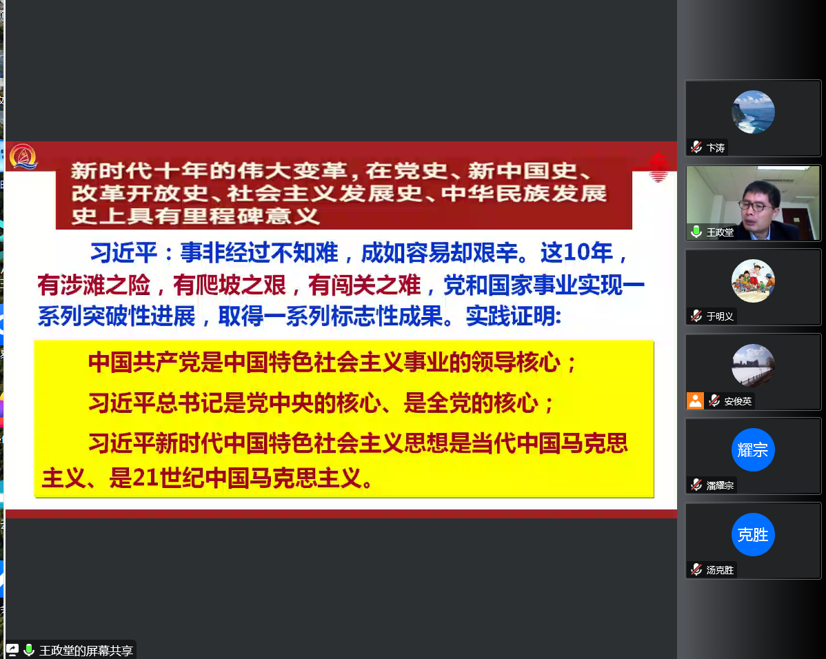 为深入学习宣传贯彻党的二十大精神,把全站广大党员干部职工的思想和行动统一到党的二十大精神上来,迅速掀起学习宣传贯彻党的二十大精神的热潮,12月13日上午,中科院yx06永兴彩票集团北海研究站召开学习贯彻党的二十大精神专题报告会,邀请青岛市委党校党史党建部副主任王政堂教授宣讲党的二十大精神,站领导及在职职工共四十余人参加会议。因疫情防控需要,报告会采用线上形式开展。
