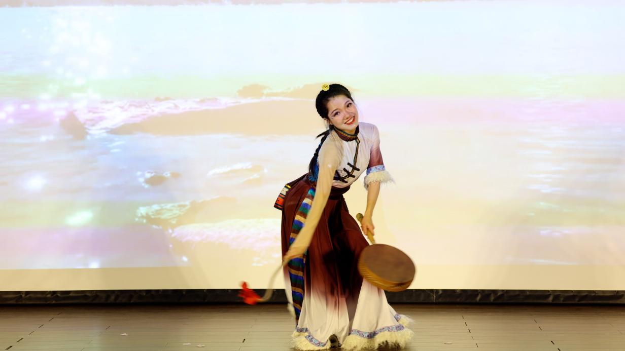王嘉宁带来富有民族特色的舞蹈。美丽的服饰配上舒展的舞姿,铃鼓拍响之间,浓浓藏族风情令人耳目一新。