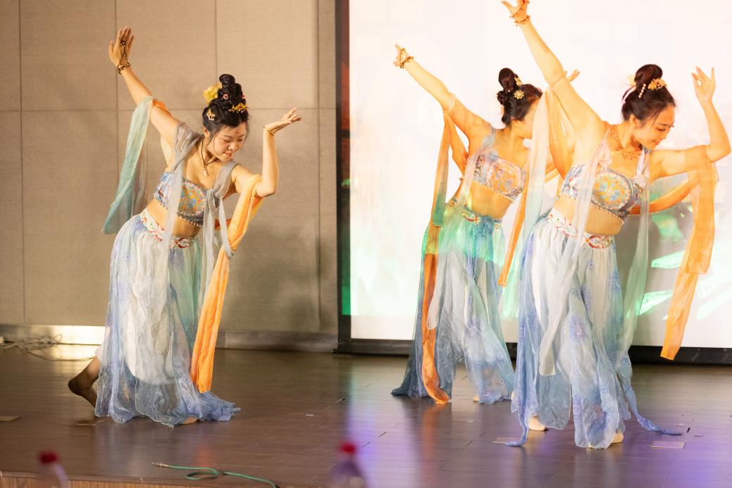钟丽群、乐霖、于游、张琨、平平带来敦煌舞,随着音乐声响起,几位舞者仿佛壁画中的飞天女神走出了画面。衣袖抛洒,腰身轻展,瞬间就将西域美景带到了大家眼前。