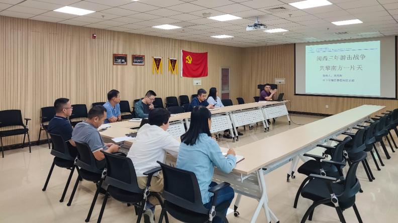 刘光辉作题为《闽西三年游击战争,共擎南方一片天》的微党课,介绍了1934年秋至1937年冬的南方三年游击战争中的英雄人物与团结战斗的故事,以及毛泽东主席对三年游击战的高度评价,向大家传达坚持党的领导,加强组织队伍建设,是革命和建设取得胜利的核心等重要启示。