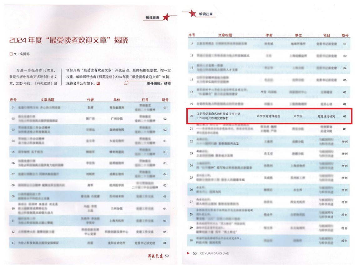 2024年度“最受读者欢迎文章”是从《科苑党建》2024年度刊发的文章中,综合特邀评审意见、经编辑部初选出50篇入围文章,再根据网络投票数及一定权重评选产生,最终有30篇文章获此殊荣。