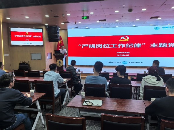 2025年4月28日,噪声与音频声学党总支召开党员大会,开展“严明岗位工作纪律”主题党日。党委委员、副所长李明庚到会指导,会议由纪检委员孙红灵主持。