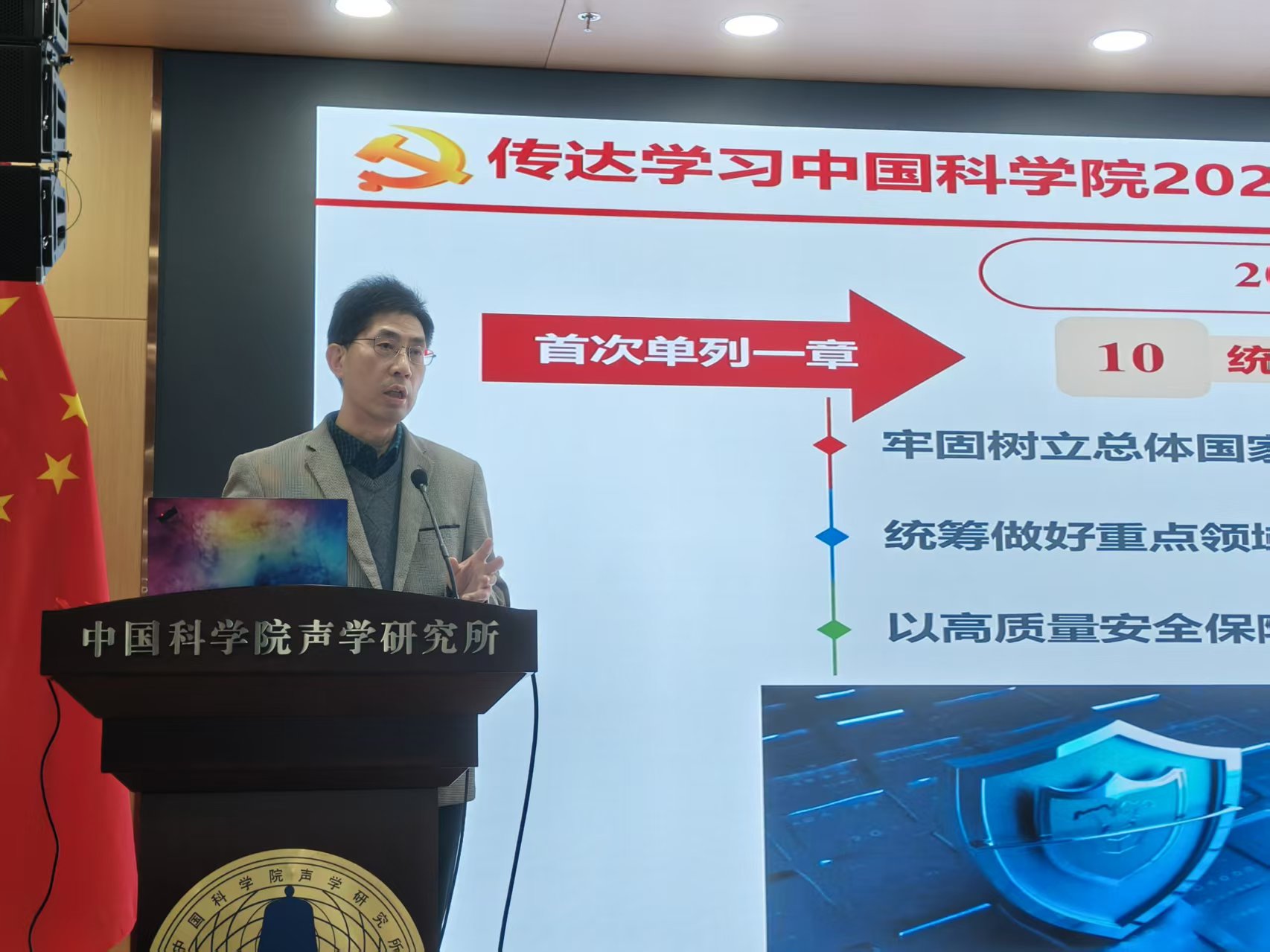 2025年11月14日,超声学党总支召开党员大会,专题学习总体国家安全观。会议由党总支副书记苏畅主持,党总支书记、实验室主任陈德华讲授主题党课。本次会议还邀请了党外科研骨干和青年学生参会,共109人参加了学习。
