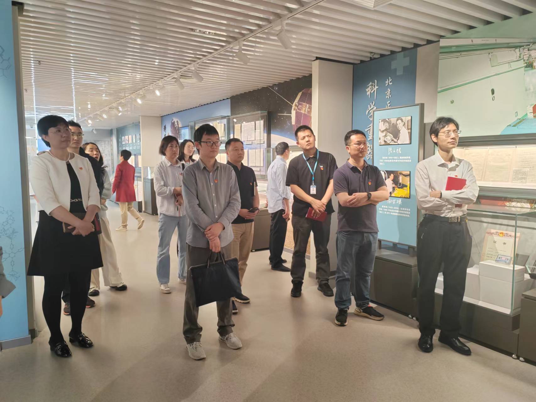 首先,大家集体参观了由中国科学院档案馆举办的“科学丰碑 档案基石——中国科学院著名科学家档案展”,展馆精选并集中展出了“两弹一星”奖章、国家最高科技奖获得者以及新中国主要学科奠基人等中国科学院百位著名科学家的珍贵档案,包括书信、论文手稿、科研工具、影音影像和实景造型等,既有科学家们代表性科研成果档案,也有反映他们个人生活、家庭家风等方面的档案。参观的党员同志们再一次近距离感悟了老一辈科学家“爱国、创新、求实、奉献、协同、育人”的精神,坚定了中国共产党人的初心和使命,努力做好“科学家精神”的“传承者”。