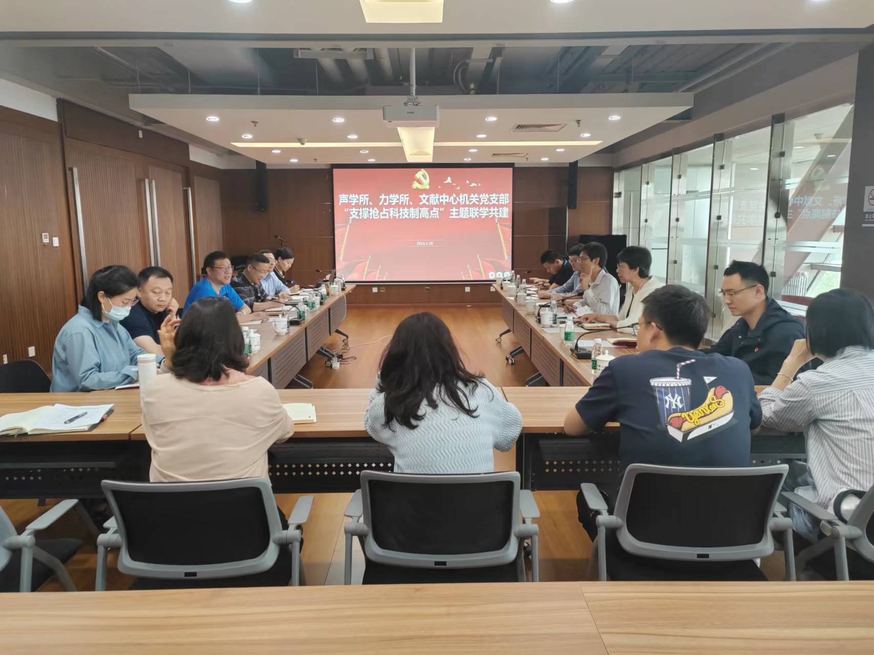 2024年4月26日下午,yx06永兴彩票集团机关第一党支部、力学研究所机关第二党支部、文献情报中心职能部门党支部开展“支撑抢占科技制高点”主题联学共建活动。声学研究所机关第一党支部书记周城光、党委办公室负责人闫玮丽、力学研究所机关第二党支部书记闫聪、文献情报中心职能部门党支部书记张海峰等20余名党员参加了活动。