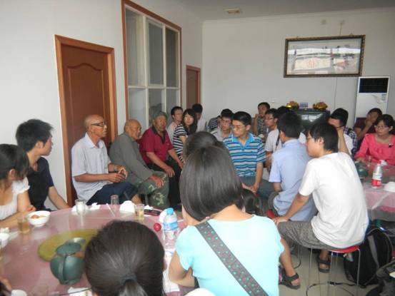 参观完焦庄户地道战遗址之后,我们在老乡的带领下来到了“农家院”。三位老爷爷早就等候在客厅了。老乡给大家介绍了三位老爷爷的情况,第一位85岁高龄的爷爷是1944年入党的老党员,也是抗日战争时期焦庄户的老支委,他的事迹还被《京华日报》等报道过;第二位72岁的爷爷曾经参加过抗美援朝战役,他52年到朝鲜,之后在朝鲜度过了6年的艰苦岁月;第三位爷爷是三位中年龄最小的,抗日时期他是儿童团的团长,当时才只有11岁。
