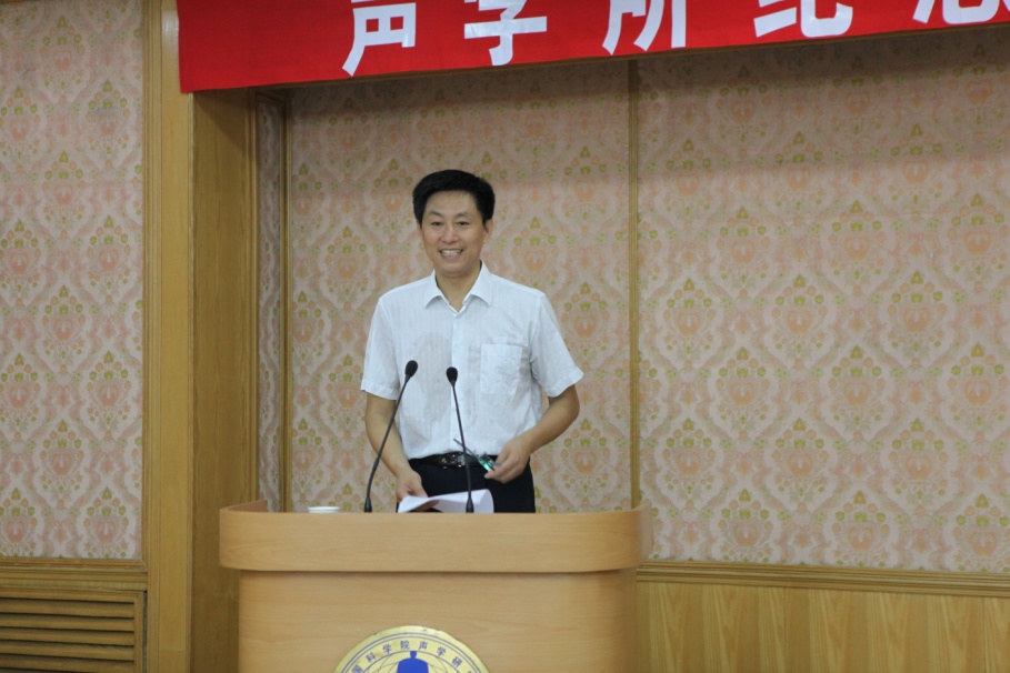图像声纳支部的贺鹏飞同志代表新党员发言,他说能在这样特殊的日子加入党组织感觉非常光荣,心情非常激动,并表示要以老党员们为榜样,牢记党的宗旨,勤于钻研,开拓进取,勇于创新,为国家声学事业的发展贡献自己的青春力量。
