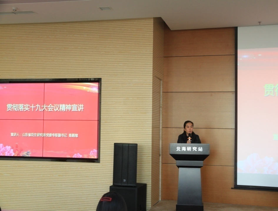 11月24日上午,山东省花生研究所党委专职副书记陈殿绪到北海站做了十九大精神的宣讲报告,会议由北海站党委书记安俊英主持,北海站全体员工共50余人参加此次活动。