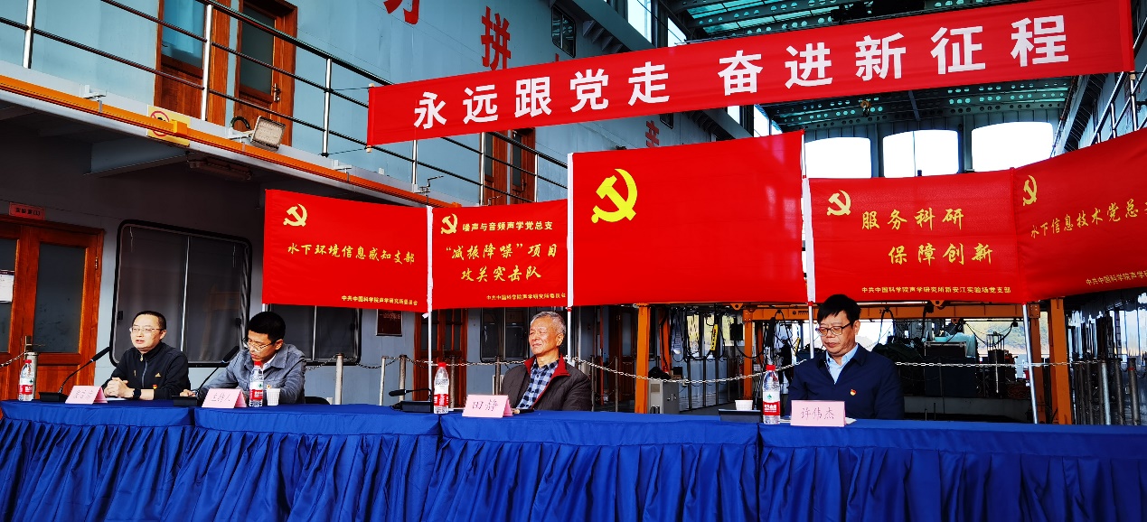 2022年10月31日上午,中科院yx06永兴彩票集团噪声与音频声学党总支联合新安江实验场党支部、水下信息技术党总支和水下环境信息感知党支部在新安江实验场实验船上开展了“永远跟党走,奋进新征程”党支部联学联建活动,二十大列席代表田静从二十大会议总体情况、会议主要精神以及个人体会三个方面为大家传达讲解了二十大会议精神,正在湖上开展实验工作的三十多位党员及积极分子参加了学习活动。东海站站长、新安江实验场主任许伟杰,噪声与音频声学实验室主任、“减振降噪”项目攻关突击队队长程晓斌,水下信息技术实验室副主任王朋,水下环境信息感知实验室副主任贾宁,新安江实验场老支部书记刘月明和新安江实验场副主任、支部书记金榜等同志结合自身工作,分享了学习二十大精神的心得体会。