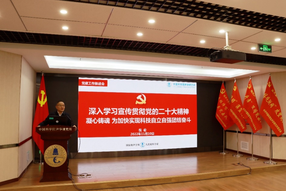 倪宏强调,学习宣传贯彻党的二十大精神是当前和今后一个时期的首要政治任务,要按照中央和院党组要求,迅速掀起学习宣传贯彻党的二十大精神的热潮,以昂扬的精神状态、务实的工作作风学习宣传贯彻党的二十大精神,切实把党员干部职工、青年学生的思想统一到党的二十大精神上来。作为“国家队”“国家人”,必须心系“国家事”、肩扛“国家责”,全所党员干部职工、青年学生要以党的二十大精神为引领,凝心聚力营造良好的政治氛围,聚焦主责主业,狠抓工作落实。在新时代新征程上,自信自强、守正创新,踔厉奋发、勇毅前行,把党的二十大精神与科技创新实际工作有机融合,履行好国家战略科技力量主力军职责,加快实现高水平科技自立自强,为全面建设社会主义现代化国家、全面推进中华民族伟大复兴贡献智慧和力量。
