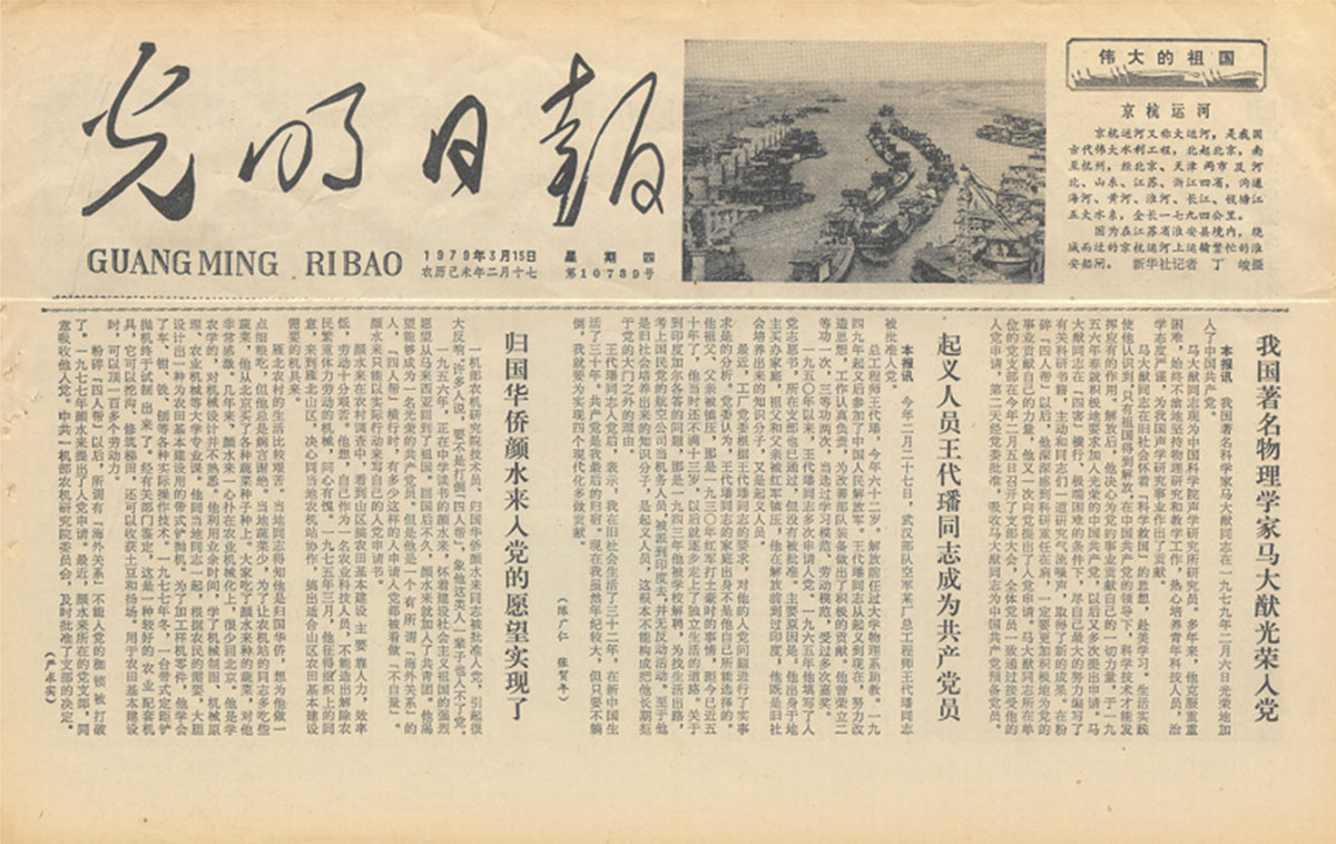 1979年3月15日的《光明日报》头版刊发文章,准确记录了马大猷的入党日期为1979年2月6日。