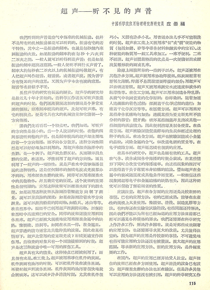 1956年6月14日,应崇福在《人民日报》撰文首次公开普及超声,概括性描述了超声的特点及应用。这是1956年第13期《新华半月刊》转载的这篇文章。