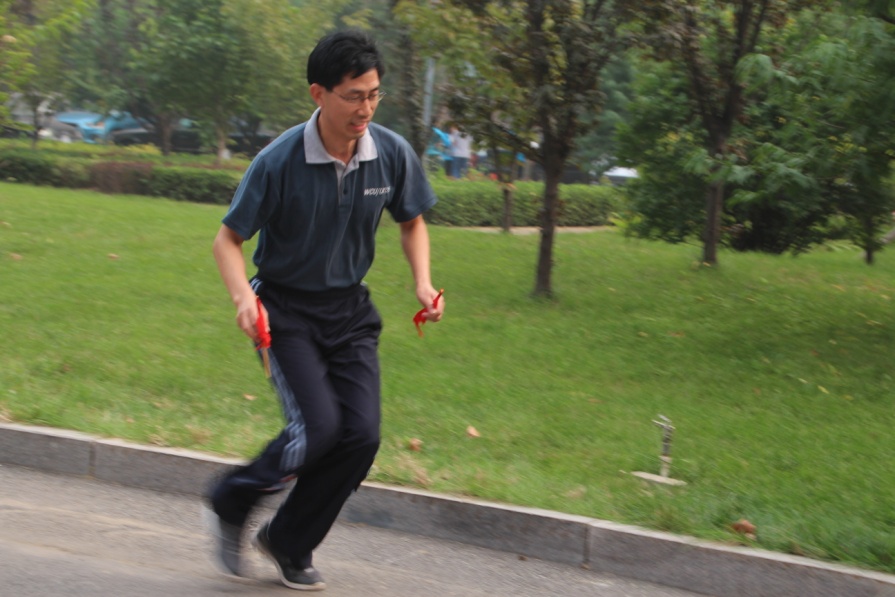 比赛在热烈的开幕式后紧张而有序的展开了。比赛共有插红旗接力、单人跳绳、背靠背双人运球、托球接力等四个比赛项目和“小燕飞”一个健身体验项目,每个项目都在工作人员的主持下紧张有序的进行着。