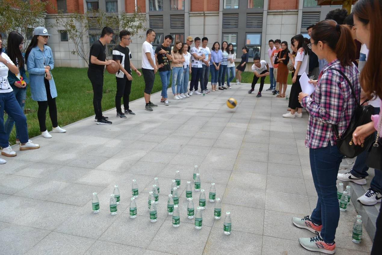 最后,进行户外游戏。游戏总共三个项目:“打保龄球”——丢球的各种姿态让大家开始放松下来,真正进入游戏状态;“乒乓球接力”考验大家平衡能力。S型的跑道,有人为了平衡和追求更快的速度,把身体也扭成了S型,让观众们为此欢呼;“跳大绳”——让每个人都参与进来。新生们意犹未尽,强烈要求加游戏,便进行了“你划我猜”——精彩的表演,完美的猜词默契,让大家兴奋不已。