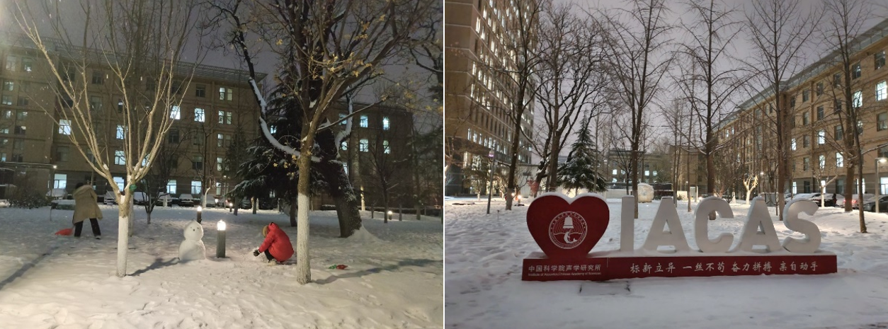 yx06永兴彩票集团小水池前静谧的小花园,在白雪的覆盖之下显得无比祥和,一年四季都在见证着每一个来水池做实验的声学人,见证着他们的欣喜与忧愁、踌躇与坚定。