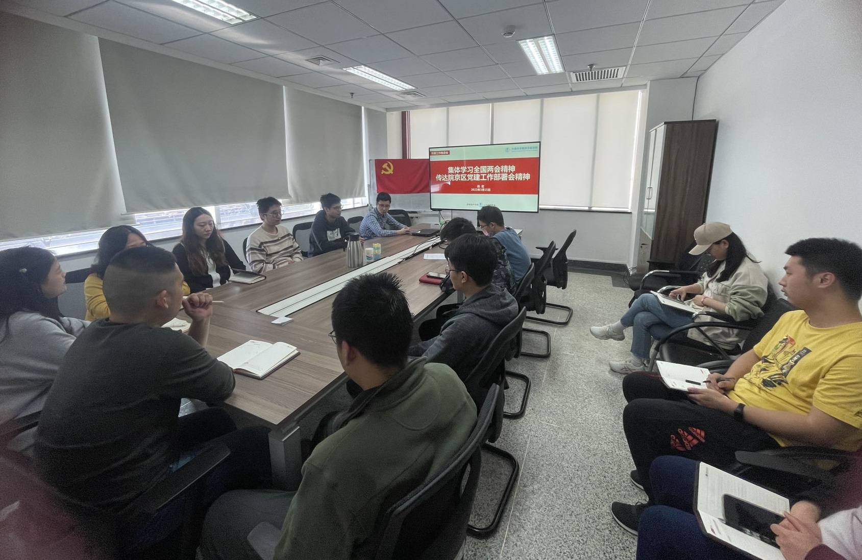 首先,吴京洪带领大家一起学习了全国两会精神并传达了院京区党建工作部署会精神,主要包括对“2023年全国两会精神”“国务院机构改革方案”和“中科院2023年京区党建工作部署会”三个方面的内容进行了学习和传达。