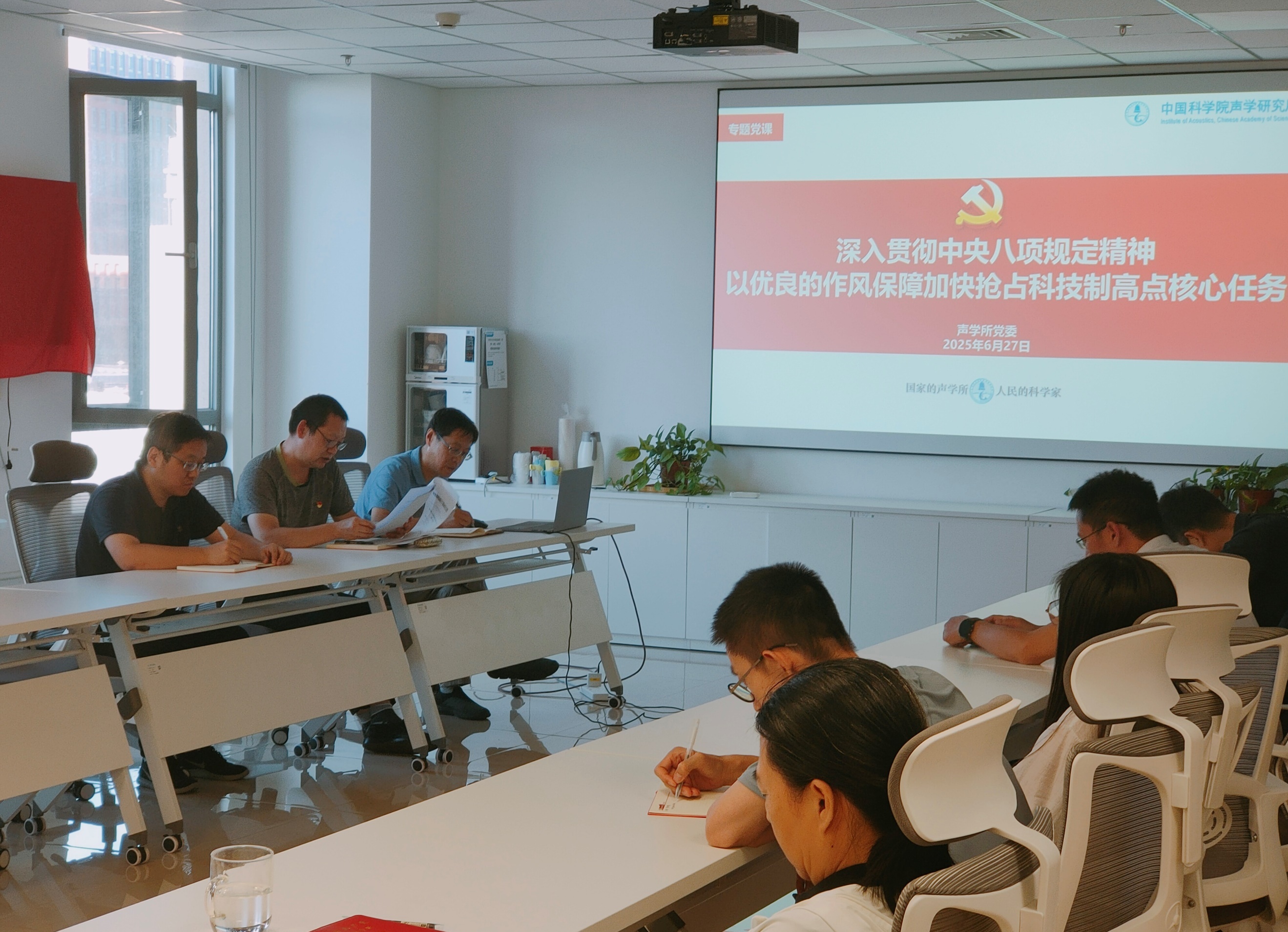 刘明刚带领与会党员学习了《深入贯彻中央八项规定精神 以优良的作风保障加快抢占科技制高点核心任务》专题党课与《党政机关厉行节约反对浪费条例》。他强调,党员同志要在日常生活中贯彻落实中央八项规定精神,厉行勤俭节约,反对铺张浪费,让优良作风在新时代科技攻关中熠熠生辉。
