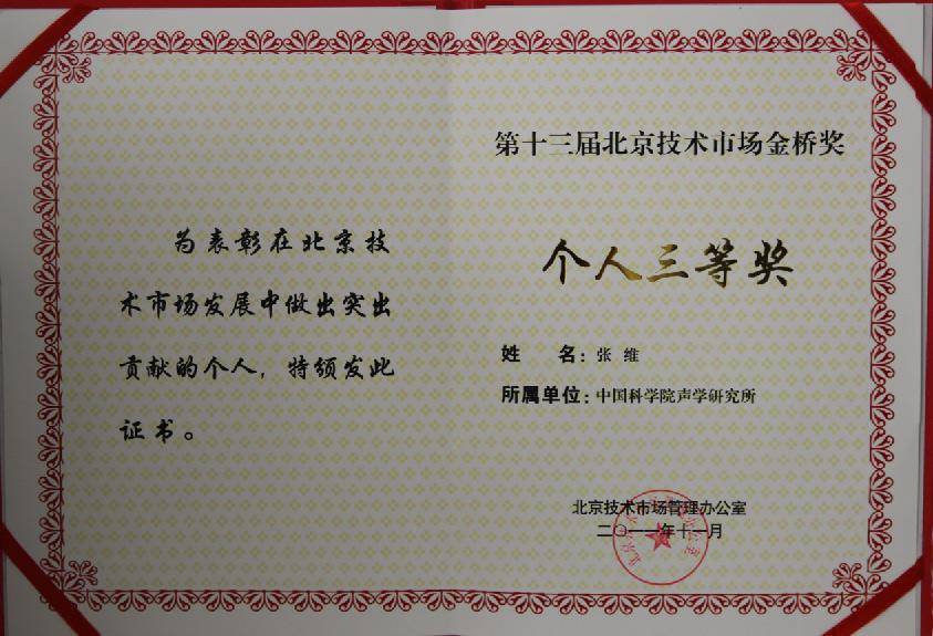 北京技术市场管理办公室日前公布了“第十三届北京技术市场金桥奖”获奖名单,我所科技处张维同志荣获“第十三届北京技术市场金桥奖”个人三等奖。
