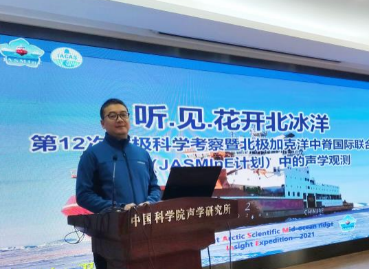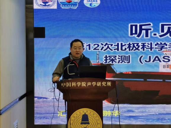 卫翀华作《听·见·花开北冰洋——第12次北极科学考察暨北极加克洋中脊国际联合探测(JASMInE计划)中的声学观测》的报告。报告首先介绍了第12次北极科考的整体概况,而后,展开介绍了加克洋中脊深部地质结构的重要研究意义,声纳浮标等极地声学装备的实验方案设计,和极低水声学实验的开展情况以及极低水声学实验对理解低、高频信号冰下混响及散射规律,冰层覆盖下声场传播规律与频率、深度的关系等的重要意义。最后,报告分享了科考船上的精彩生活,以及对我国北极科考事业发展的感想。