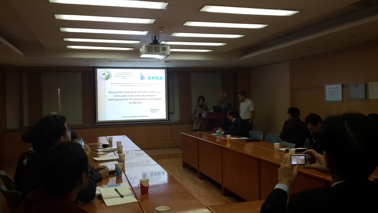 接着,研讨会在德昭楼218会议室举行。会议开始时,李晓东主任向参会代表介绍了本单位的发展历程和研究现状。然后,杨亦春研究员介绍了课题组在低频次声波用于地震监测和预测方面的相关研究成果。接着,来自俄罗斯和中国地质大学(武汉)的三位专家做了学术报告。俄罗斯的V. Sibgatulin教授做了题为“Assessment of gravitational tides impact on stress and strain state of geological environment for the purposes of earthquake prediction”的报告,介绍了引力潮对地球地应力的影响及其在地震预测中的应用。中国地质大学(武汉)杨蔚然教授和曾佐勋教授分别介绍了“陆内灾害性地震成因和地震预测”以及“地震预测的理论方法与实践”的相关研究。三位专家的报告向我们介绍的都是目前俄罗斯和国内在地震监测和预测方面的先进研究成果,开拓了我们的视野。