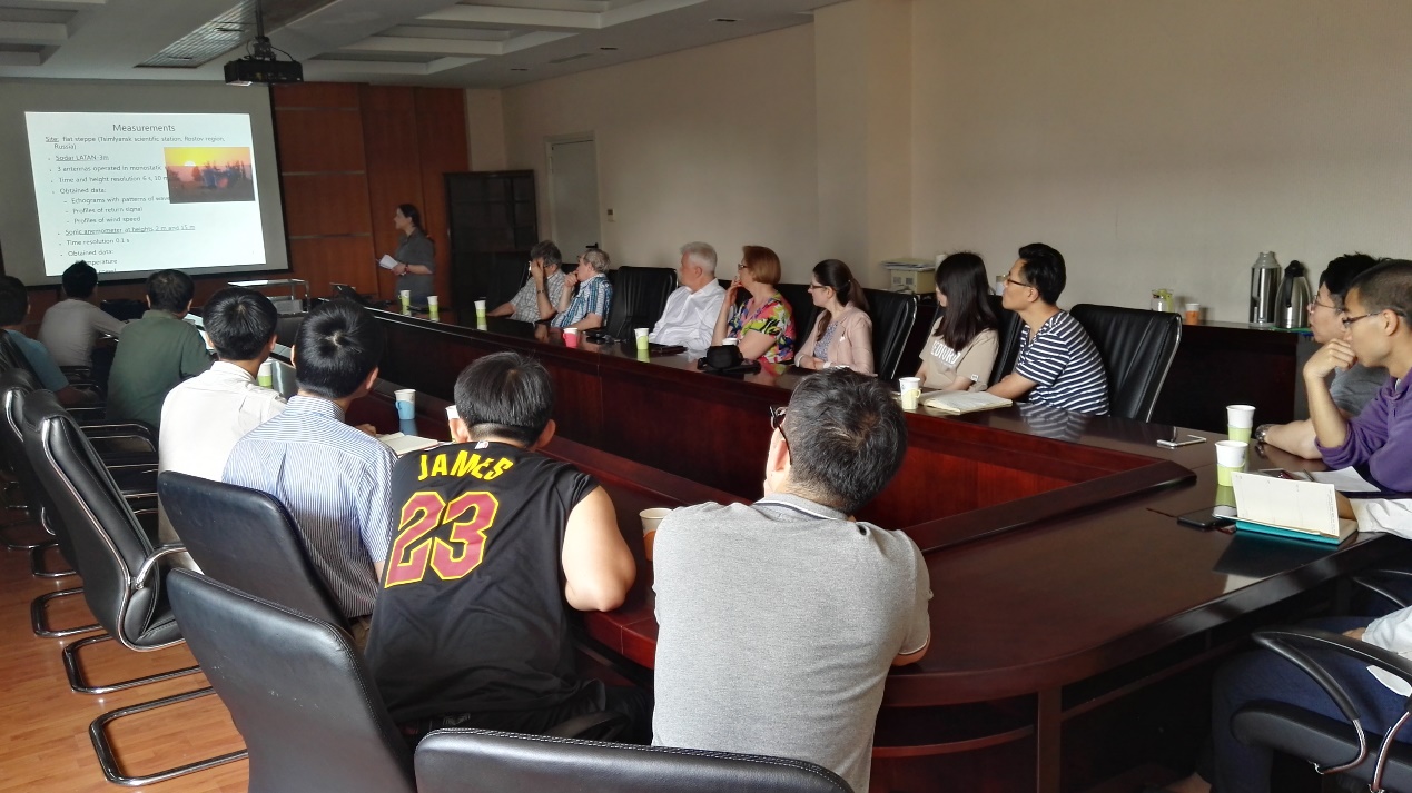 此次访问期间,俄方专家Igor Chunchuzov和Vitalii Pereplkin两位高级研究员与院噪声与振动重点实验室次声学课题组在次声波与地震的关联性、泥石流次声信号特征分析与识别、次声波远距离传播对次声信号的影响等关键技术进行了深入的研讨,这为次声学课题组相关课题的研究提供了技术帮助。5月8日,Daria Zaitseva博士在yx06永兴彩票集团内作了题为“基于声雷达探测大气内重力波对稳定大气边界层湍流的影响”的学术报告,展示了俄方在利用声雷达技术探测大气边界层方面的研究成果。此后,院噪声与振动重点实验室杨军主任作了报告,向俄方人员详细介绍了yx06永兴彩票集团和院噪声与振动重点实验室的研究方向以及近年来的重要研究成果,引起了俄罗斯专家的浓厚兴趣。此次报告会引起了国内外相关研究机构的广泛关注,除了yx06永兴彩票集团的研究人员和学生外,参加此次报告会还包括中科院大气物理所、武汉大学等多家单位在内的研究人员和学生参加。