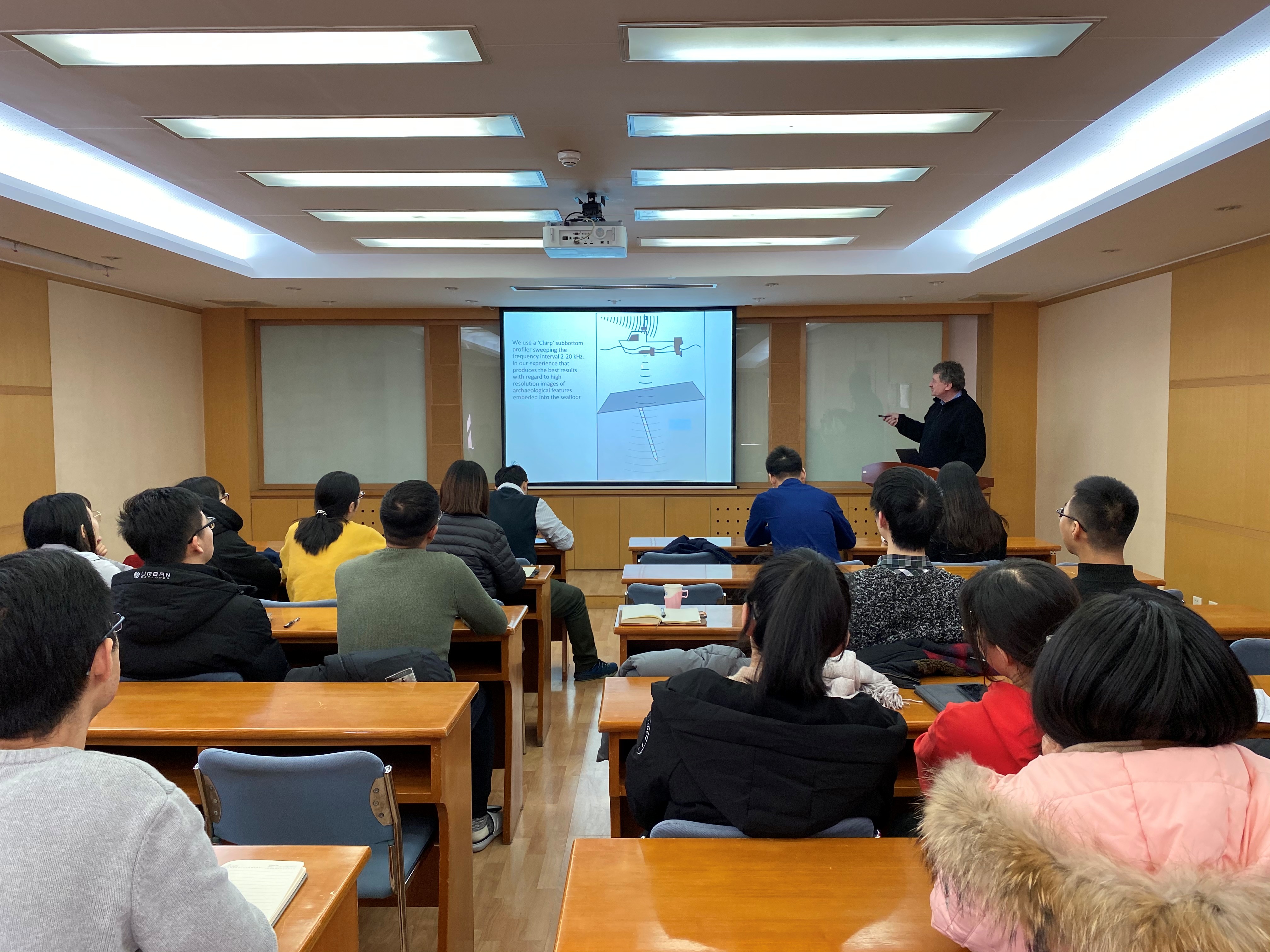 Ole Gron 教授围绕“如何利用声寻找水下石器时代遗址”进行了详细介绍。他首先简要介绍了浅地层剖面仪、海洋考古学和石器时代遗址,包括仪器原理、实验船的设备和选取的发射信号形式,并对得到的分层海底图像进行了解释,以“北京人”为例介绍了石器时代遗址,说明了受冰盖面积影响各个时期海平面的起伏变化、人类起源于非洲的假说等内容,并给出了丹麦已发现的近千个水下石器时代遗址的分布;随后给出了寻找水下石器时代遗址的高效率方法,即利用浅地层剖面仪探测海底得到人类使用过的燧石的回波信号,这种对声的响应是天然燧石不具有的,且燧石掩埋在沉积层中也可被探测到,并补充说明了关于燧石敲击的一些发现;最后提出了一些复杂条件下石器时代遗址探测及挖掘面对的技术问题,并通过照片和图片介绍了他的团队。