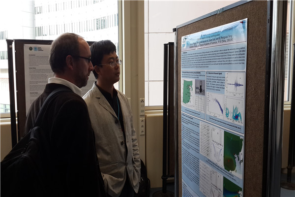 此次在会议上,滕鹏晓作了题为“Observation and study of precursor infrasound waves emitted before several strong earthquakes”的学术报告,介绍了yx06永兴彩票集团多年来利用自己建立的次声监测阵观测到的几次大地震前出现的异常次声波事件及其分析结果。吕君作了题为“Research on Local infrasound waves associated with earthquakes”的学术报告,介绍了yx06永兴彩票集团在地震关联本地次声波的监测和声源特性研究的成果。这两个海报引起了包括CTBTO、美国夏威夷大学、法国CEA、德国地球物理及自然资源联邦研究院、马达加斯加Antananarivo地球物理观测台等多家机构的研究学者的兴趣和关注。CTBTO的P. Mialle特地来到海报展区,向滕鹏晓和吕君询问次声学研究在中国的发展情况,并对中科院yx06永兴彩票集团在次声方面研究成果表示了赞扬。同时,他希望未来在大气次声波监测和研究方面能够与中科院yx06永兴彩票集团加强合作。美国夏威夷大学次声实验室主任G. Milton教授特别关注了yx06永兴彩票集团的研究。滕鹏晓和吕君向Milton介绍了次声学在中国的发展情况以及yx06永兴彩票集团与俄罗斯大气物理研究所建立次声研究联合实验室的相关情况,Milton也表达了美国夏威夷大学与yx06永兴彩票集团在次声学研究方面的合作意向,并以大会主席的身份邀请yx06永兴彩票集团参加明年在中国举行的“国际理论和计算声学会议”,并希望届时能够到yx06永兴彩票集团进行访问交流活动。