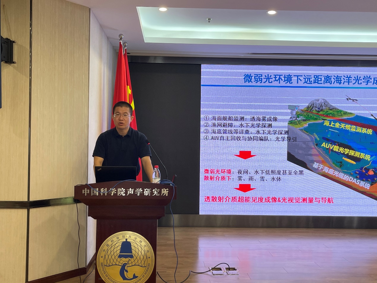 王新伟作《微弱光环境下远距离海洋光学成像及定位技术》的报告。报告从光在水介质中传播的局限性出发,分别从消除光散射和利用光散射两种思路,阐释了透过散射介质的二维/三维光成像技术和水下矢量光视觉导引技术,并介绍了目前在水下平台应用的一些案例。报告最后展望了光学领域和声学领域在水下探测应用技术中交叉融合的发展前景,希望能与声学开展更为深入的交流合作。
