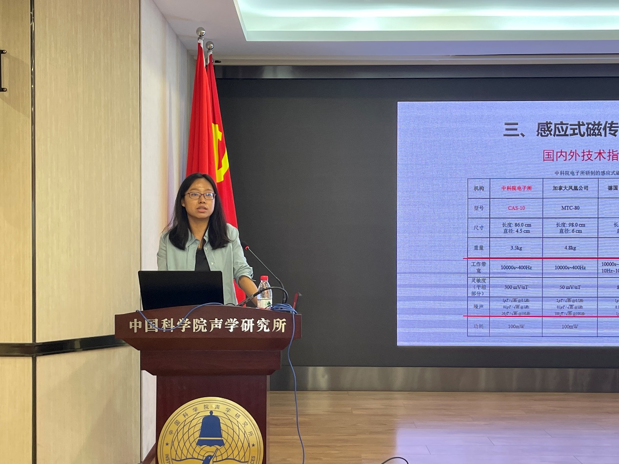 闫彬作《高灵敏度磁场传感器及其应用》的报告。报告对比介绍了感应式、磁通门、原子磁场等磁传感器的基本原理和特点,以及平台磁测降噪技术,并展示了机载磁探测仪器的应用案例,同与会人员探讨了利用磁在水下开展应用的一些难点问题以及声磁联合探测在未来的合作前景。