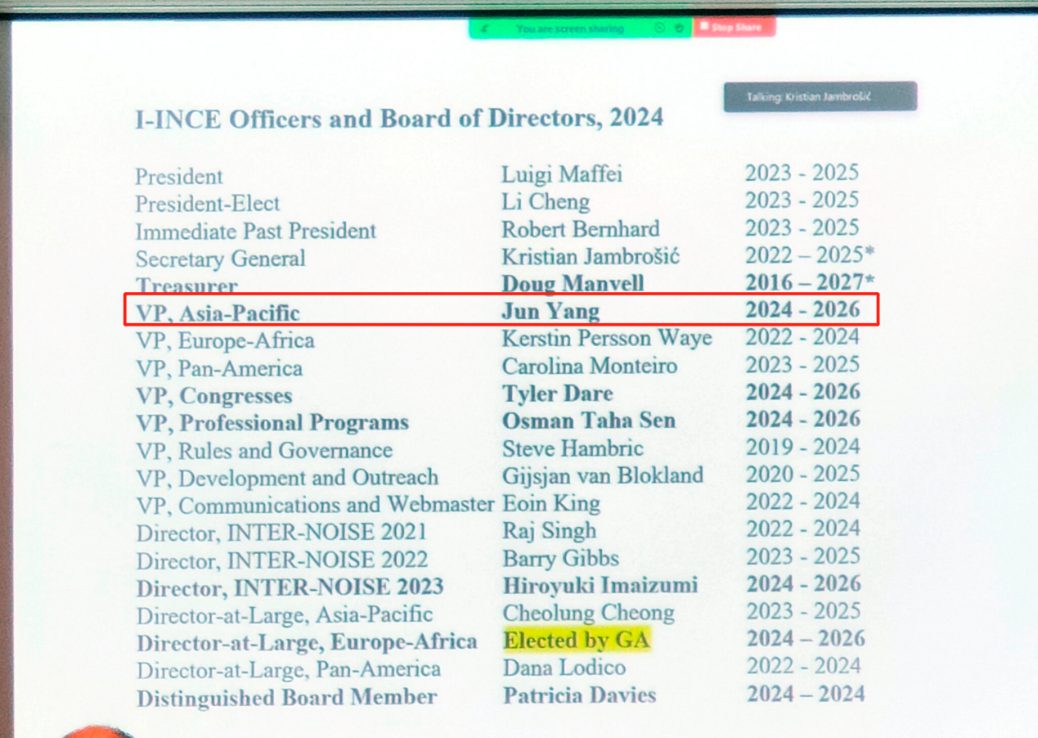 第52届国际噪声控制工程大会(International Congress and Exposition on Noise Control Engineering,Inter-Noise 2023)于2023年8月20日至23日在日本千叶国际会展中心举行。yx06永兴彩票集团杨军等一行9人应邀参加了会议。会上杨军副所长当选为国际噪声控制工程学会(I-INCE)副主席(亚太区),任期2024年至2026年。