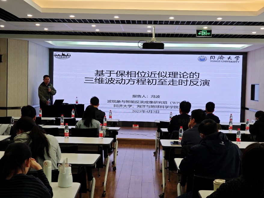 冯波作题为《基于保相位近似理论的三维波动方程初至走时反演》的学术报告。报告首先系统剖析了传统波动方程反演理论中"弱散射"假设对初始模型的强依赖性这一核心瓶颈。针对这一难题,报告人创新性地提出保相位近似理论,通过精确计算强扰动模型中的前向散射波相位扰动,成功突破了传统线性化近似的理论局限。在此基础上,报告在小角前向散射假设下严格推导出保相位解的线性化近似表达式,显著拓展了波动方程线性化反演理论的应用边界。进一步地,通过将保相位近似与有限频层析技术深度融合,发展出三维波动方程保相位初至层析方法,为起伏地表及强横向变速等复杂地质条件下的近地表速度建模提供了新范式。