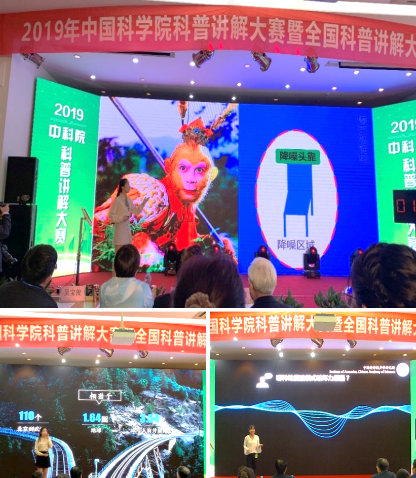 中科院噪声与振动重点实验室的冯雨薇以“如何让高铁上的噪声消失”为主题,以武侠小说中的“以毒攻毒”为引,生动讲解了降噪头靠“以声消声”的声波相消性干涉原理,博得全场评委和观众的热烈掌声。来自超声技术中心的王聪,从轨道安全出发,以人们所熟知的“拍一拍,挑西瓜”到“B超体检”为例,形象地介绍了超声技术在轨道检测中的应用。超声技术中心的邹亮桃以地震波的强大破坏力为切入点,介绍声表面波的原理、发展历程及实际应用,在4分钟的时间里带领大家探索了地震波的“用处”。