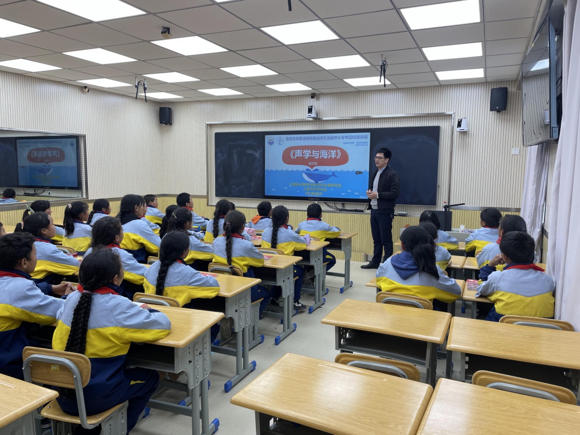 东海站科研科科长诸向阳代表研究站参加本次活动,并为久治县民族小学五年级全体学生作了《声学与海洋》的科普报告。报告从初识声音、了解海洋、潜水器的故事等四个方面深入浅出地介绍了声音秘密,并通过观看科普动画片、潜航器科考视频等进一步拓宽了学生对海洋知识的了解。