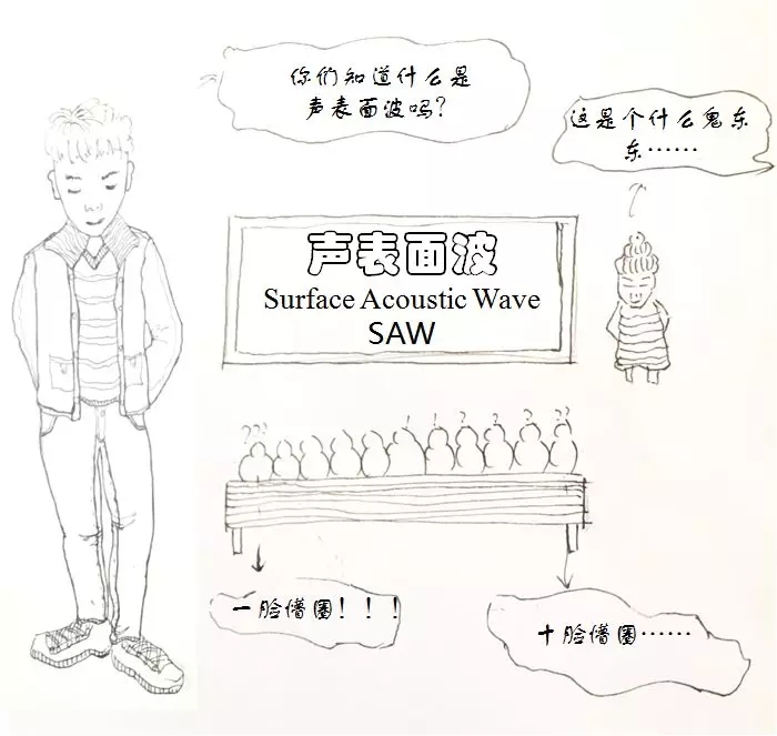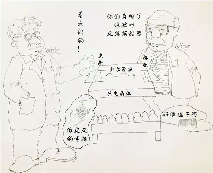 科学家在具有压电性能的晶体表面,做上周期性正负相间的金属电极,然后给电极加上很小很小的电信号,就能在晶体表面激发出能被我们控制的声表面波。这个沿着晶体表面传播的声表面波很微弱,弱到人们都无法直观感觉到,如果在它的传播路径上摆放一个周期相同的电极,当声表面波传到这个电极处的时候,科学家就能将它捕获,并转化成方便处理的电信号。