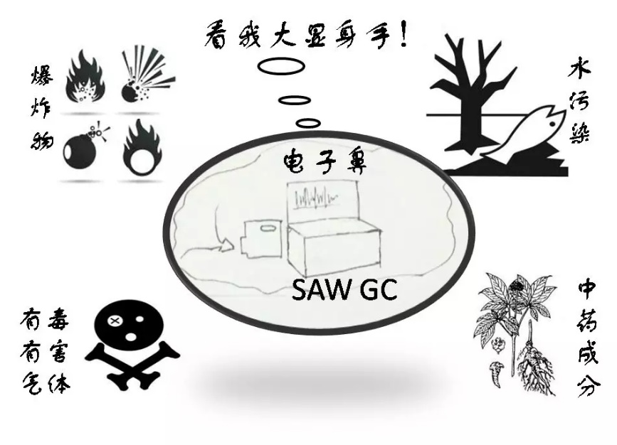 通过计算“小集团”们分别跑出柱口的时间,我们能够知道它们的“身份”;紧接着将“小集团”们吸附到声表面波芯片表面,测量它们引发的声表面波速度变化值,我们能够知道它们的“体重”,这样就完全实现了电子鼻的两大功能:不但“闻味辨物”,还能告诉你“物”有多少。这个神奇的电子鼻就是声表面波气相色谱仪(SAWGC)!