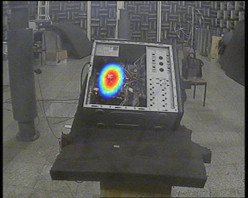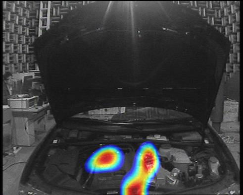目前,声相仪在工业上主要用于鉴别噪声源的位置,可以用来分析飞机飞行中汽车、火车行驶中发出的各类噪声。检测电动机、发机电、汽柴油机、空调、冰箱、洗衣机、电话机、程交换机、计算机等各种设备的噪声。下图便是半消声室中测量汽车噪声的声像图,可以通过声音用来检测汽车故障以及定位故障发生的方位。声相仪还可以用来分析室内声场,从而知道室内声场