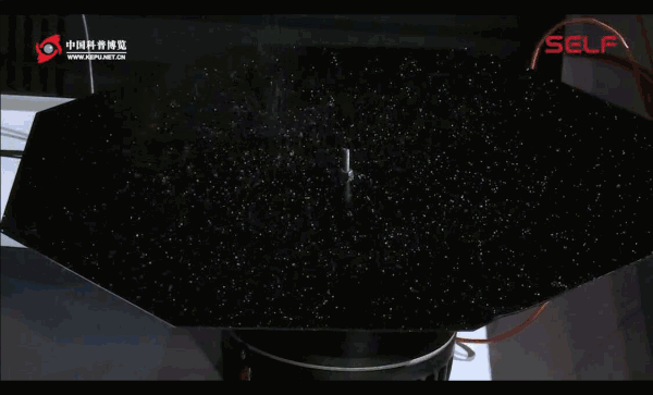 我们再把频率调高一下看一看。看!这些食盐颗粒它发生了移动!自己跑了!大家可以想想这是什么原理?我们继续调高频率看看花纹还会变──大家看这个图案越来越复杂了,大概有一圈、两圈、三圈、有四圈了。但是这个图案还会继续变的──因为随着频率的提高,波长会变短,有限范围内它会出现更多的花纹──看这个花纹变得越来越复杂。