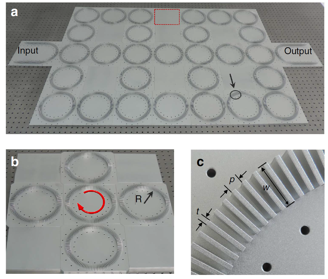 拓扑绝缘体是一类不同于金属和绝缘体的全新物态,其内部为绝缘体但表面却能导电,且该表面导电性源自材料的内禀性质,不受杂质和缺陷的影响。拓扑绝缘体因在自旋电子学、热电以及量子信息领域具有广大的应用前景而引起人们极大关注。近几年来,玻色子(光子和声子)的拓扑态也引起了人们的极大关注。贾晗副研究员与祝雪丰副教授利用二维超材料环阵列,首次实现了时间反演对称型声学拓扑绝缘体。该工作类比电子自旋,将声在超材料环中的传播方向定义为一种赝自旋。在此基础上,理论和实验同时证实了环间强耦合条件下赝自旋边界态单向拓扑传输效应。另外,在环阵列中引入适当位错,可产生一种赝自旋拓扑界面态。该工作对于探索声波单向拓扑传输,声隔离和手性声学超材料等方面具有重要意义。