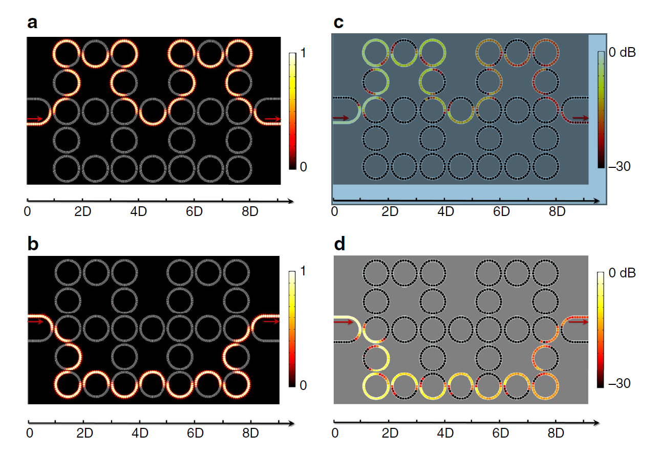 图 2 声学拓扑绝缘体中的边缘态单向拓扑传输声场图(a,b为模拟结果;c,d为实验结果)