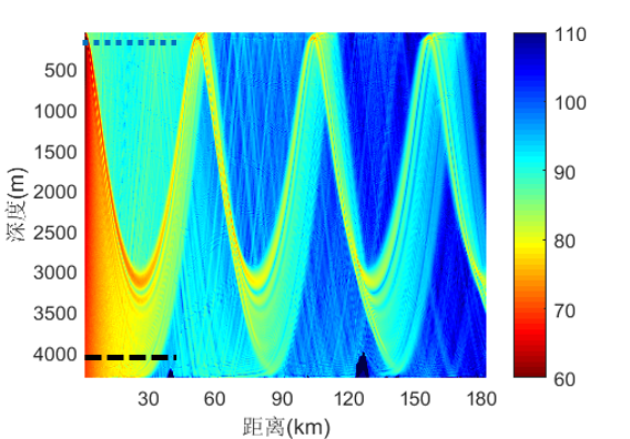 左:深海声传播特性示意图,两条虚线标出了水听器布放的深度范围;右:4152m深度上测量的传播损失与理论计算结果比较