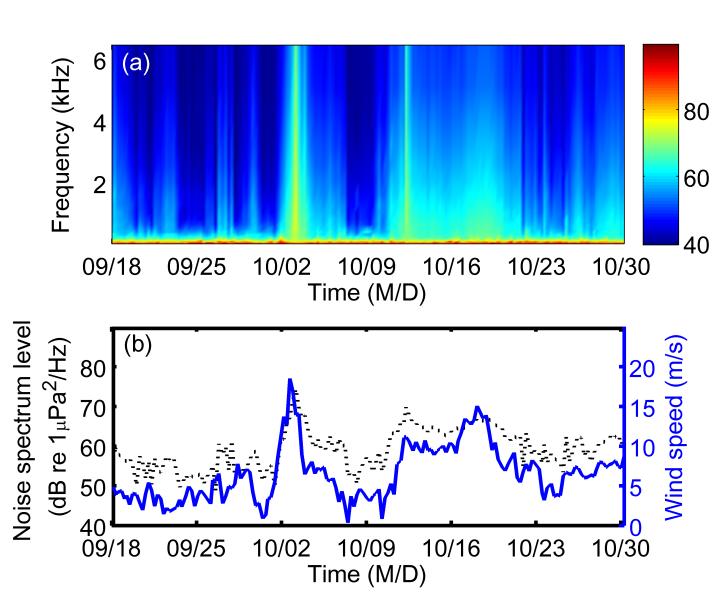 图 1 (a)实验数据噪声功率谱时间频率二维分布,(b)实验期间风速(实线)和500Hz噪声功率谱(点线)
