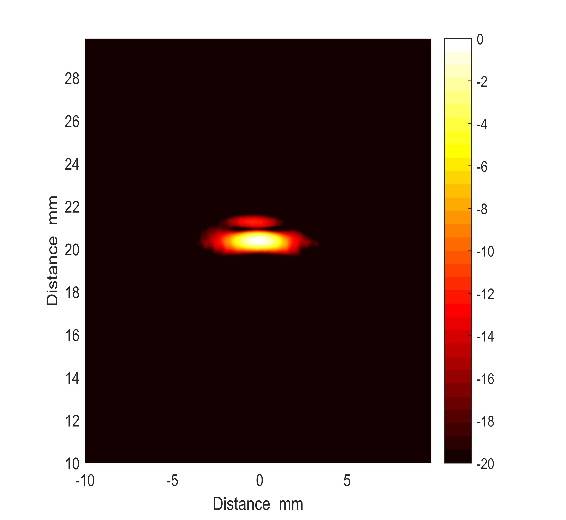 验证实验以钢内横通孔为模拟缺陷,实验结果显示,基于FPGA的TFM算法可对横通孔实现良好成像(图2),成像效率可达312.5Hz。在增加成像区域和提高成像像素数量时,计算效率维持稳定,具有较好的鲁棒性和实用性。