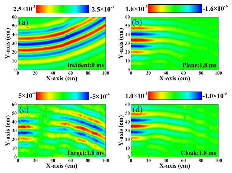 图 2. 不同情况下测量的声场,图a为入射声场,图b-图d分别为平面、散射体、覆盖隐身毯后的回波场。图b与图d非常相似,证明了隐身毯的有效性(图/毕亚峰)