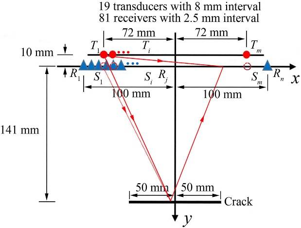 图1 横向裂纹的位置和发射-接收换能器位置(图/中科院yx06永兴彩票集团)